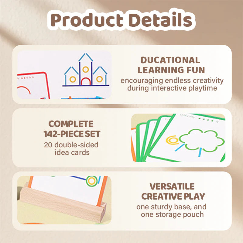KOMPLETEN SET S 142 ELEMENTI: Vključuje 120 palic in obročev, 20 dvostranskih kartic z idejami, eno trpežno podlago in eno torbo za shranjevanje. Vse, kar je potrebno za začetek ustvarjalnih vzgojno-izobraževalnih aktivnosti, je praktično embalirano v enem setu.