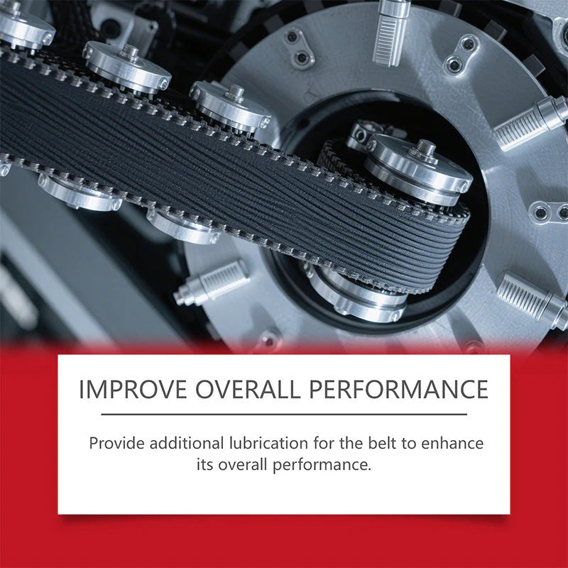 To pršilo deluje tako, da na površini gumijastega jermena ustvari zaščitno mazalno plast. Zmanjša površinsko trenje med jermenom in jermenico, preprečuje zdrs in suho razpokanje, hkrati pa obnovi prožnost in oprijem. Rezultat? Tišji motor in izboljšana zmogljivost.